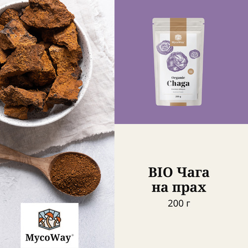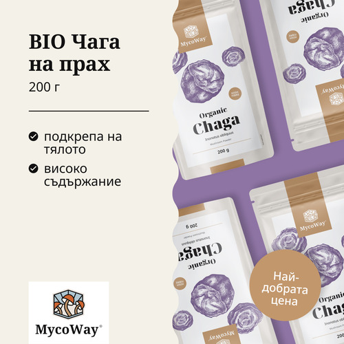 Чага на прах е изключително лесен и удобен начин да осигурите на организма си всички благотворни ефекти на тази гъба. BIO Чага на прах съдържа само плодното тяло от гъбата, без мицел, и е изключително универсална - може лесно да се добавя към различни ястия или да се смесва във вода, чай, кафе, какао, кисело мляко, сок или смути.